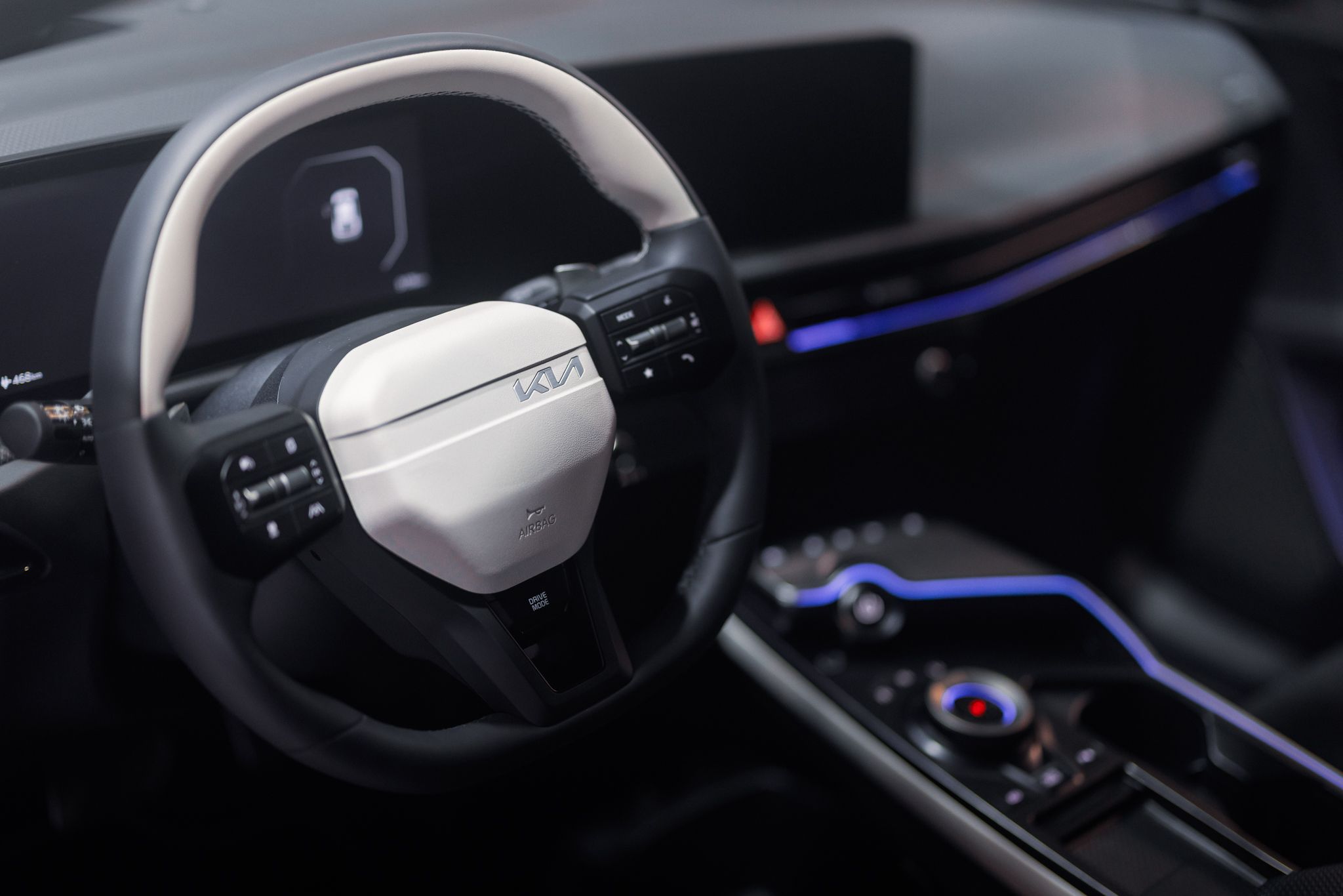 Tryby jazdy można wybrać za pomocą przycisku na kierownicy. Tryby Eco, Normal, Sport i My Drive mogą być łatwo przełączane przez kierowcę w zależności od warunków lub pożądanego stylu jazdy, a tłumienie wstrząsów, układ kierowniczy i wyczucie hamulców są zoptymalizowane dla każdego trybu. Seledynowe przyciski GT na kierownicy włączają tryb GT, aby uwolnić pełny potencjał wydajności EV6 GT.