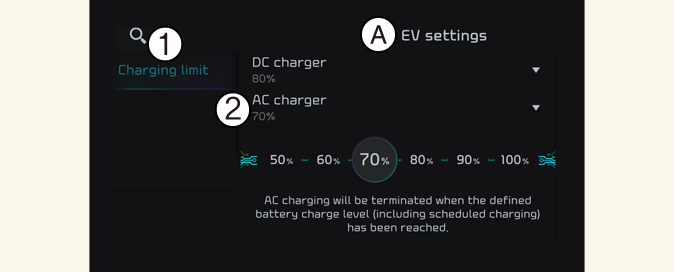 Select the icon on the screen. You can set the charging limit, charging current, Battery conditioning mode and utility mode functions.