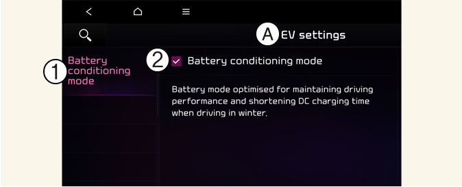 The Battery conditioning mode is efficient during the winter time when the high voltage battery temperature is low. This mode is recommended to improve driving and DC charging performances during winter. However, the driving distance may be reduced as the energy is required to increase battery temperature.
