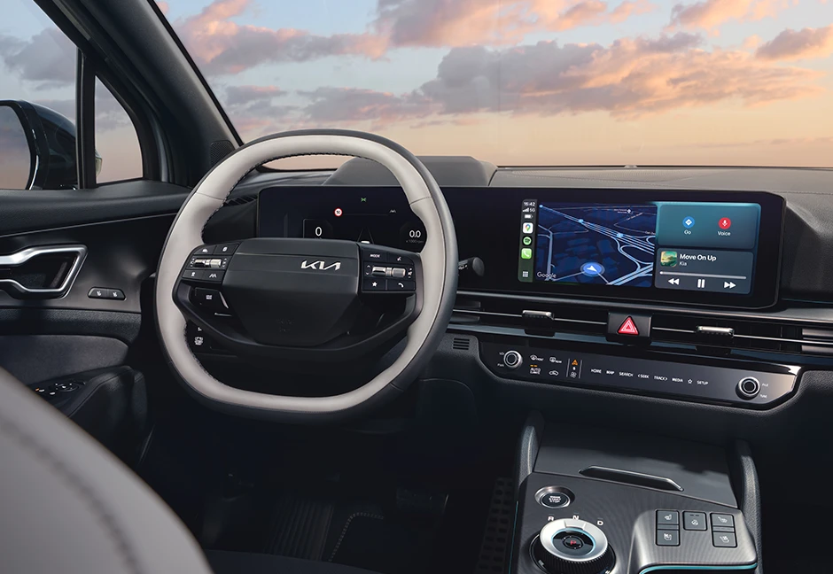 Der neue Kia Sportage Hybrid bietet dir und allen Passagieren großzügigen Komfort. Wer im Fond mitfährt, genießt zum Beispiel die größte Beinfreiheit in dieser Fahrzeugklasse. Bei der Ausgestaltung des Interieurs kannst du zwischen vielen attraktiven Farboptionen und hochwertigen Materialien wählen. Exklusiv für die GT-Line ist ein sportliches Zwei-Ton-Design in Weiß und Schwarz erhältlich. Die Sitzbezüge der Ausstattungslinien Vision und Spirit gibt es wahlweise in Leder, Veloursleder oder Ledernachbildung. Mit der optionalen Ambient-Beleuchtung (ab Spirit) kannst du das Lichtlayout im Innenraum je nach Stimmung variieren.