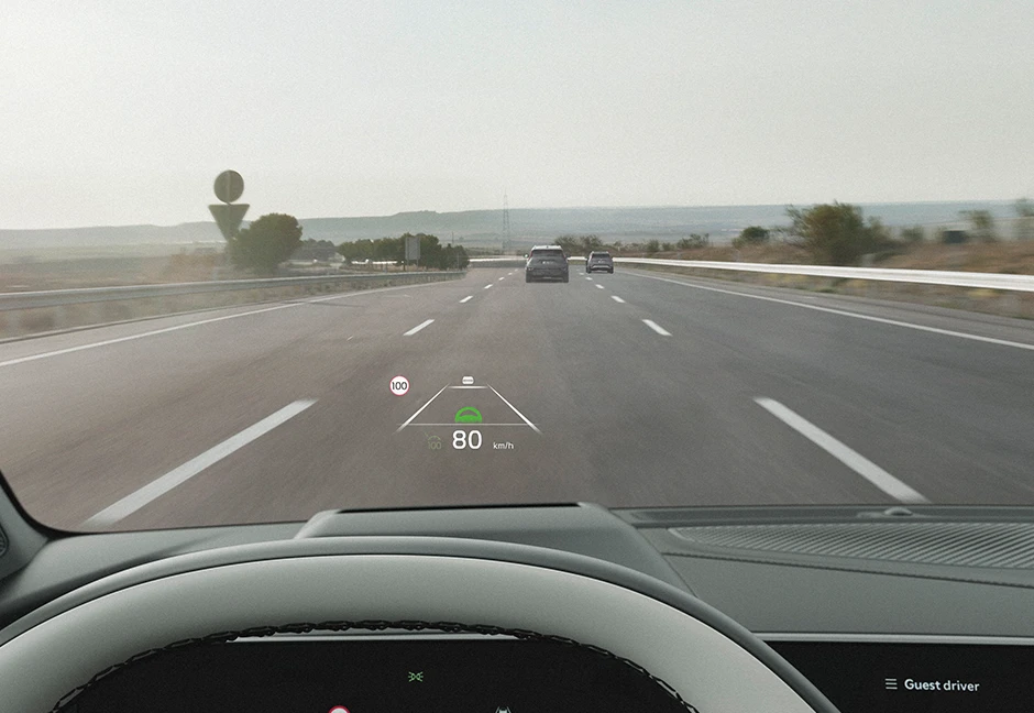 Alles Wichtige im Blick: Das optionale Head-up-Display (HUD) projiziert Informationen des Kombiinstruments, der Assistenzsysteme und des Navigationssystems transparent auf die Windschutzscheibe. So hast du deine Fahrgeschwindigkeit, die Routenführung, aktuelle Verkehrsdaten oder Sicherheitshinweise immer vor Augen – ohne die Straße aus dem Blick zu lassen.