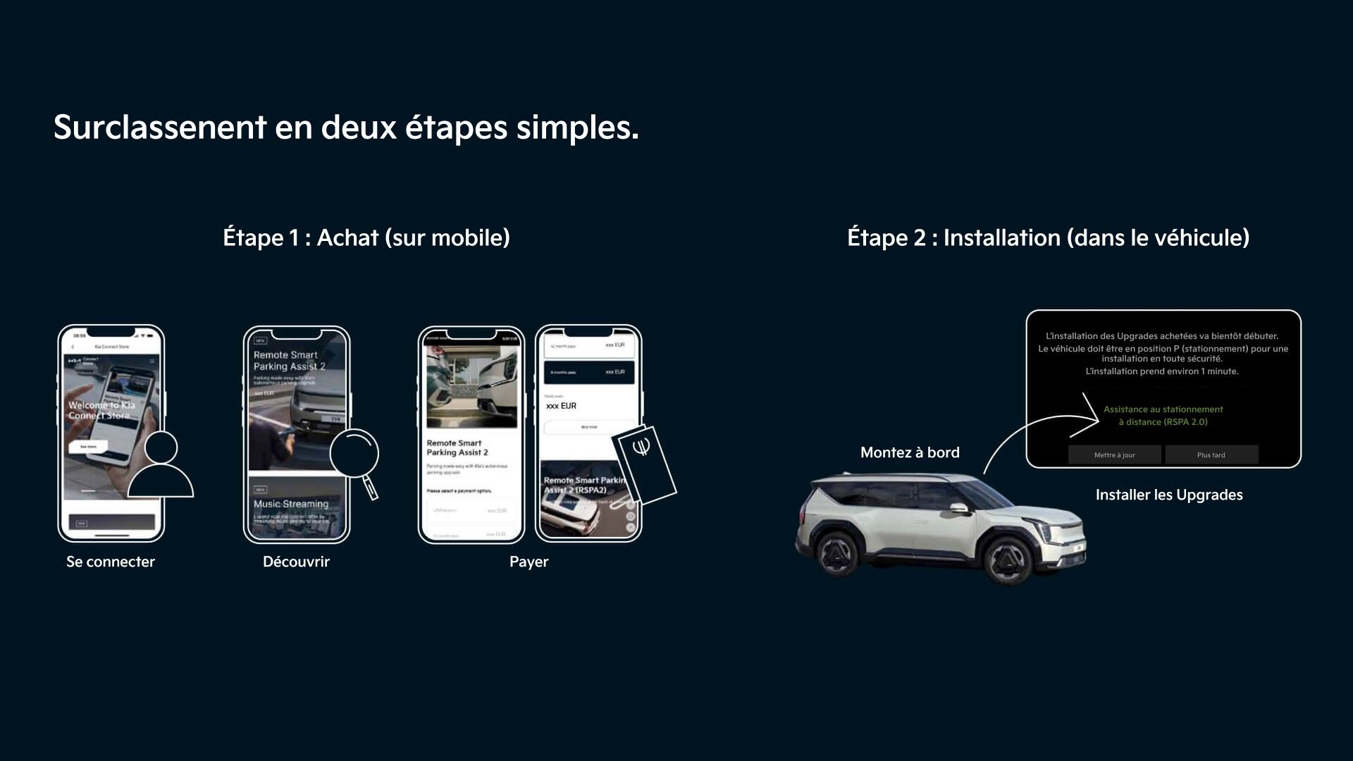 Nous prévoyons d’étendre la disponibilité des Upgrades à d’autres véhicules à l’avenir. Actuellement, EV9 est le seul modèle qui prend en charge les Upgrades via le Kia Connect Store.