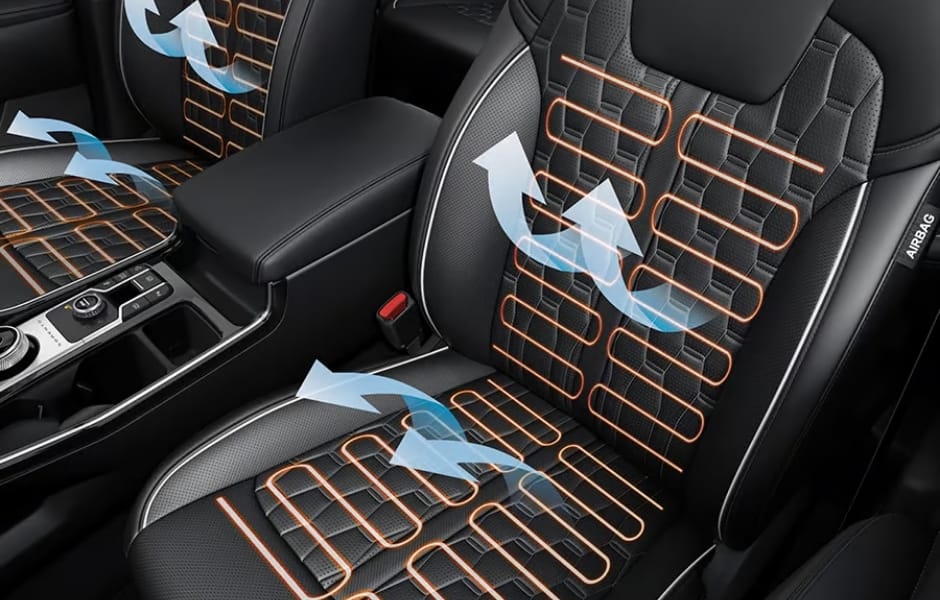 The Kia Sorento PHEV เบาะนั่งคู่หน้ารองรับทุกสภาพอากาศด้วย ที่นั่งแบบระบายอากาศและระบบอุ่นเบาะ