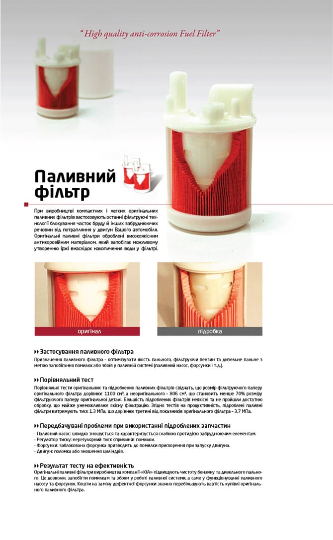 Оригінальні запчастини KIA розроблені та спроектовані виключно для Вашої KIA. Протягом багатьох років були зроблені значні інвестиції у дослідження та розробки для того, щоб удосконалити дизайн, матеріали та конструкцію оригінальних деталей KIA. Ці деталі проходять випробування в різних змодельованих екстремальних умовах, щоб забезпечити якість, надійність та довговічність. Для душевного спокою, завжди наполягайте на оригінальних запасних частинах KIA.